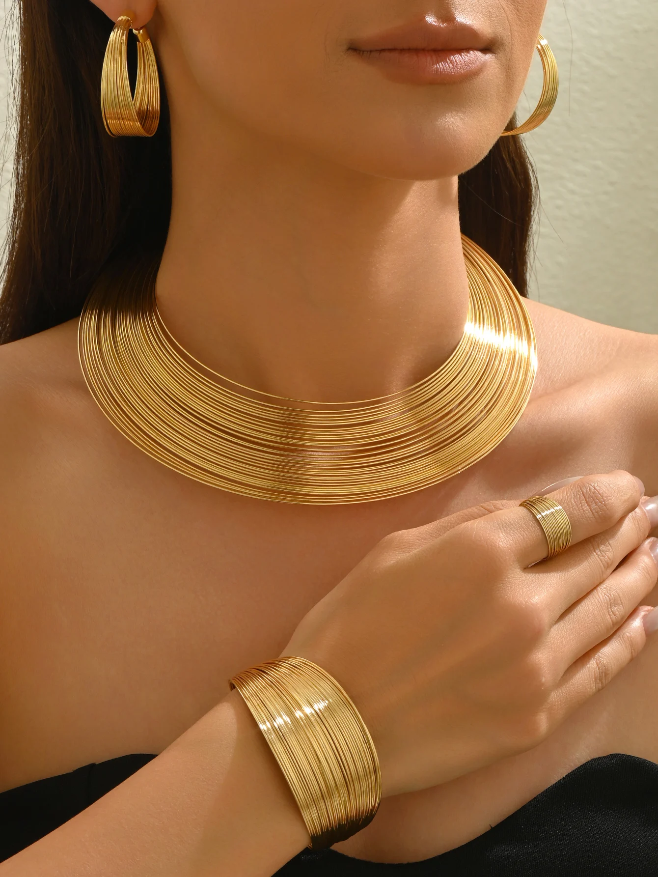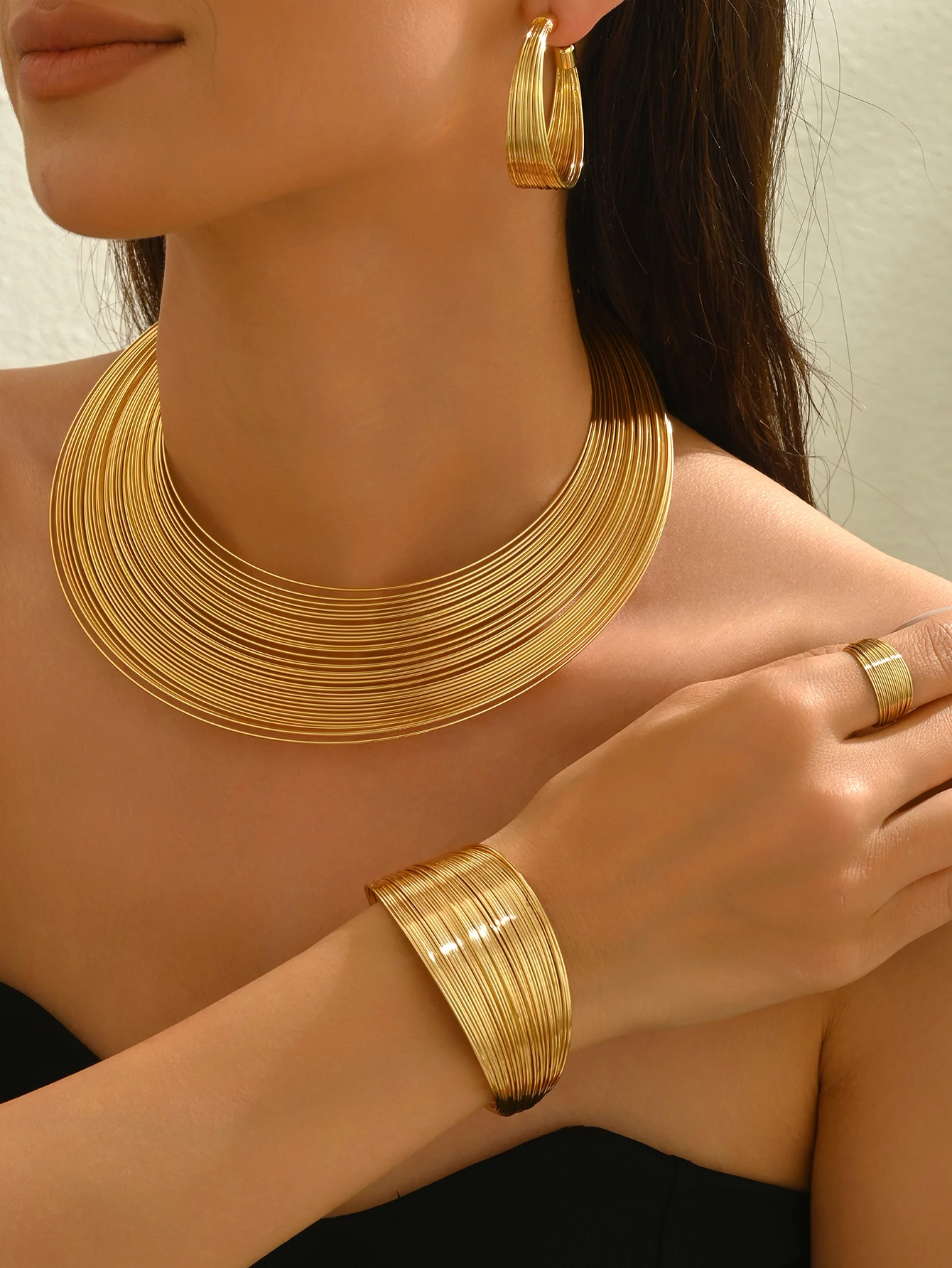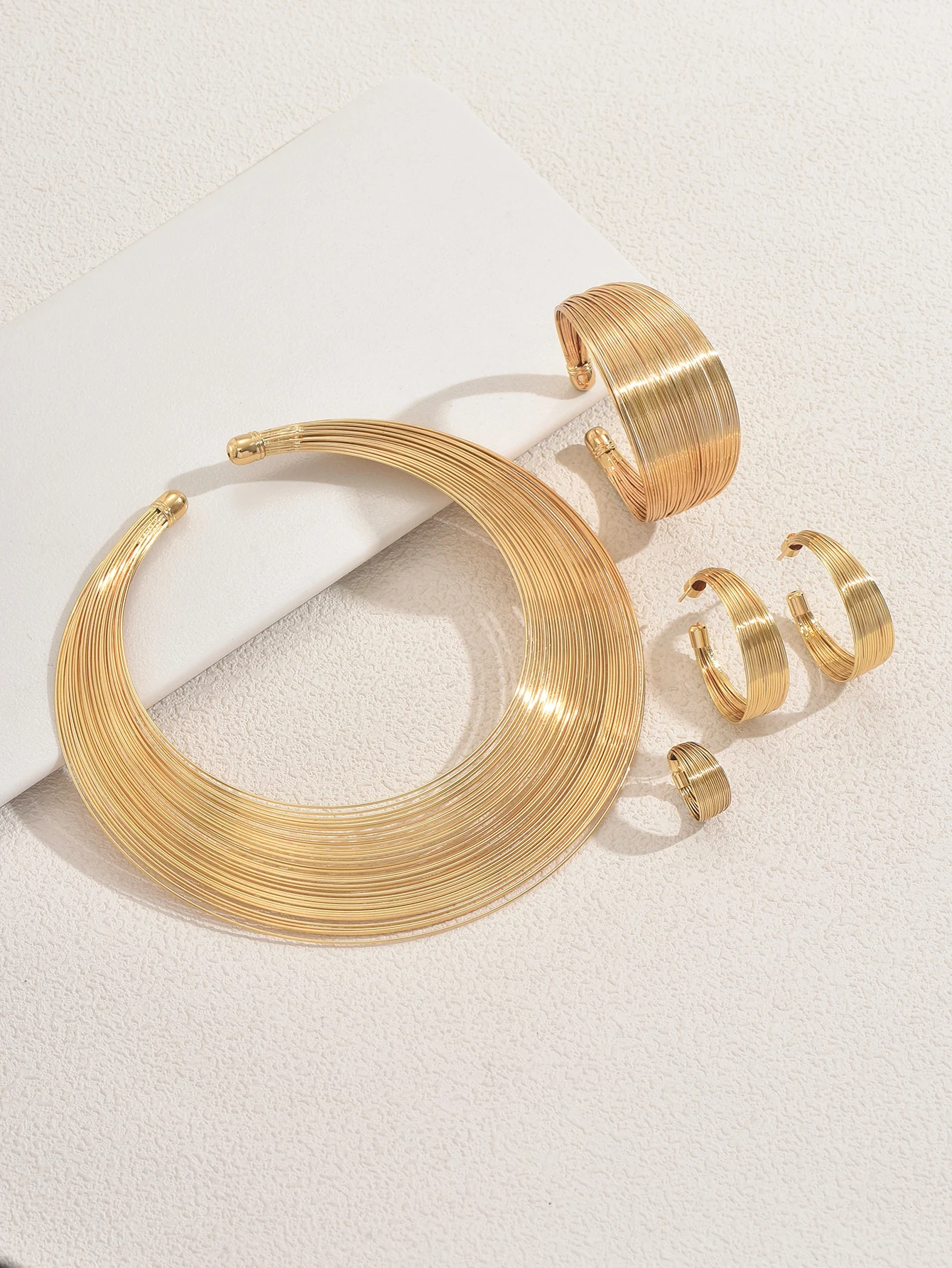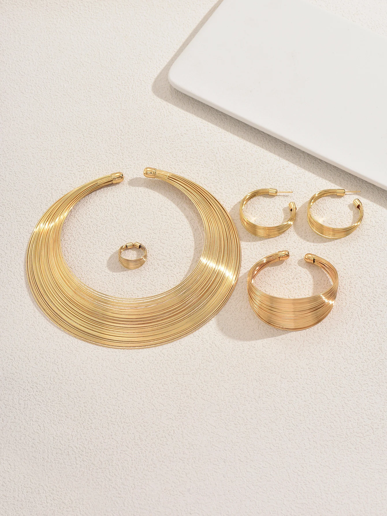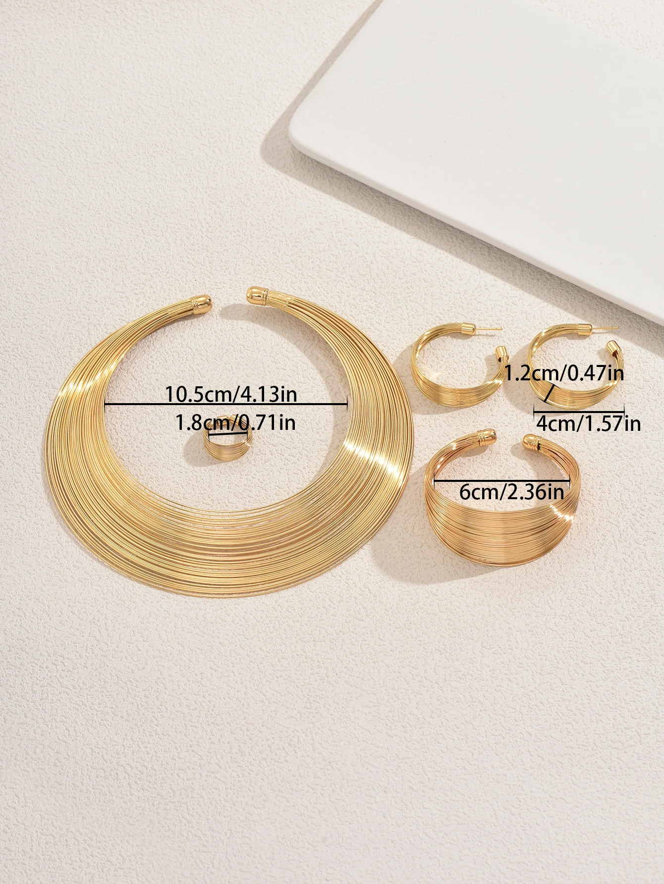 Sophisticated Gold Color Wide - band Jewelry Set Bold Choker C-shaped Earrings Ring Cuff Bracelet Set For Women